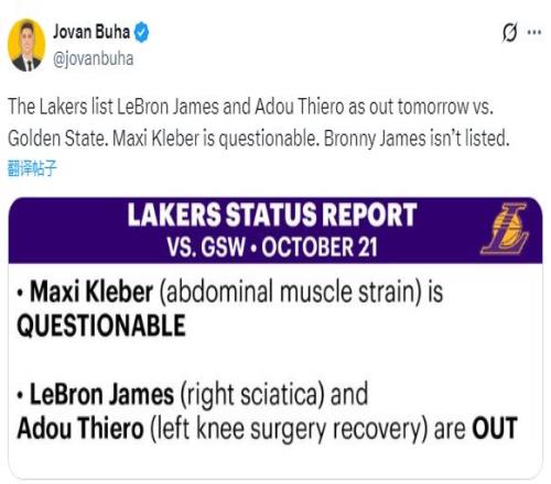 湖人官方公布揭幕战伤情报告——克莱伯(腹肌拉伤)出战成疑,50%出战可能性;詹姆斯(右侧坐骨神经痛)和阿杜-蒂耶罗(左膝手术恢复)都因伤缺席比赛;布朗尼不在伤病名单中,这意味着他的脚踝伤势已经无碍,可以回归赛场。