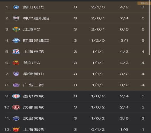 3轮战罢,申花1胜1平1负积4分,升至积分榜第5位。而成都蓉城则是1胜2负积3分跌入淘汰区,海港作为目前东亚区唯一0胜的球队,以1平2负积1分排名积分榜垫底。