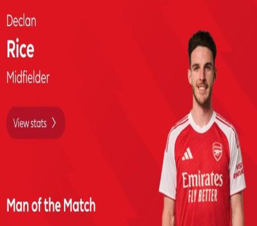 最终经过英超官网球迷投票,赖斯以71%的得票率当选全场最佳球员。